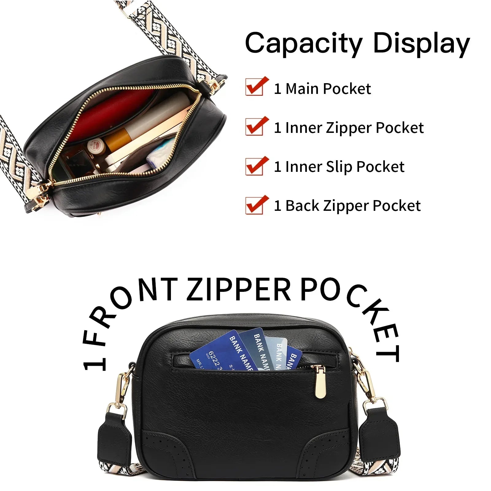 • Vakken: Hoofdvak met binnenvak met rits en kaartslots